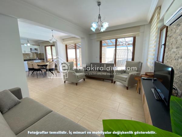 Zemin katta bulunan açık plan mutfak ve salon bölümü, misafirlerimizin konforu düşünülerek modern bir şekilde dekore edilmiştir. LCD TV, klima, 6 kişilik yemek masası ve geniş oturma grubu ile ev konforunda tatil yapmanız hedeflenmiştir.