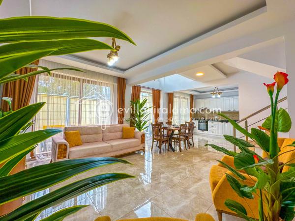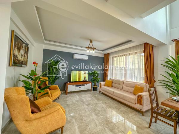 Salon: Açık plan oturma alanı, LCD TV, klima, yemek masası.