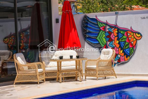 Villa Angel, taş ve ahşap mimari tasarımıyla sıcak ve huzur dolu bir atmosfere sahip. Villamızın geniş iç ve dış yaşam alanları şık ve modern şekilde dizayn edilmiş.
