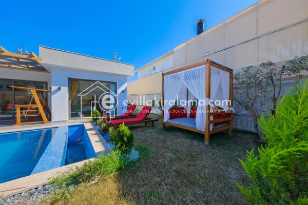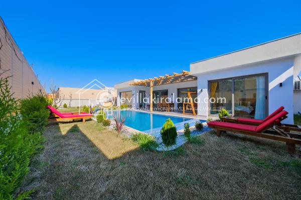 Villanın dış mekanı, geniş bir yüzme havuzu ve terası ile donatılmıştır, bu havuz terası korunaklı yapısı ile güvenilir ve rahat bir yüzme alanı sunarak tatilinize serin ve keyifli anlar katmaktadır.